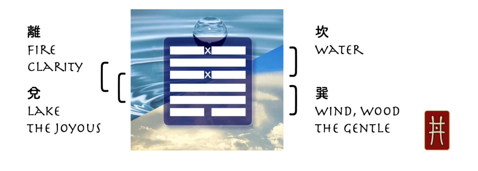 Remarkably, the two nuclear trigrams of THE WELL are Li 離 (Fire) on the top and Tui 兌 (Lake) on the bottom. The Trigram Fire is the “Second Daughter” in the I Ching family, symbolizing CLARITY; while the Trigram Lake is the “Third Daughter”, signifying JOY.